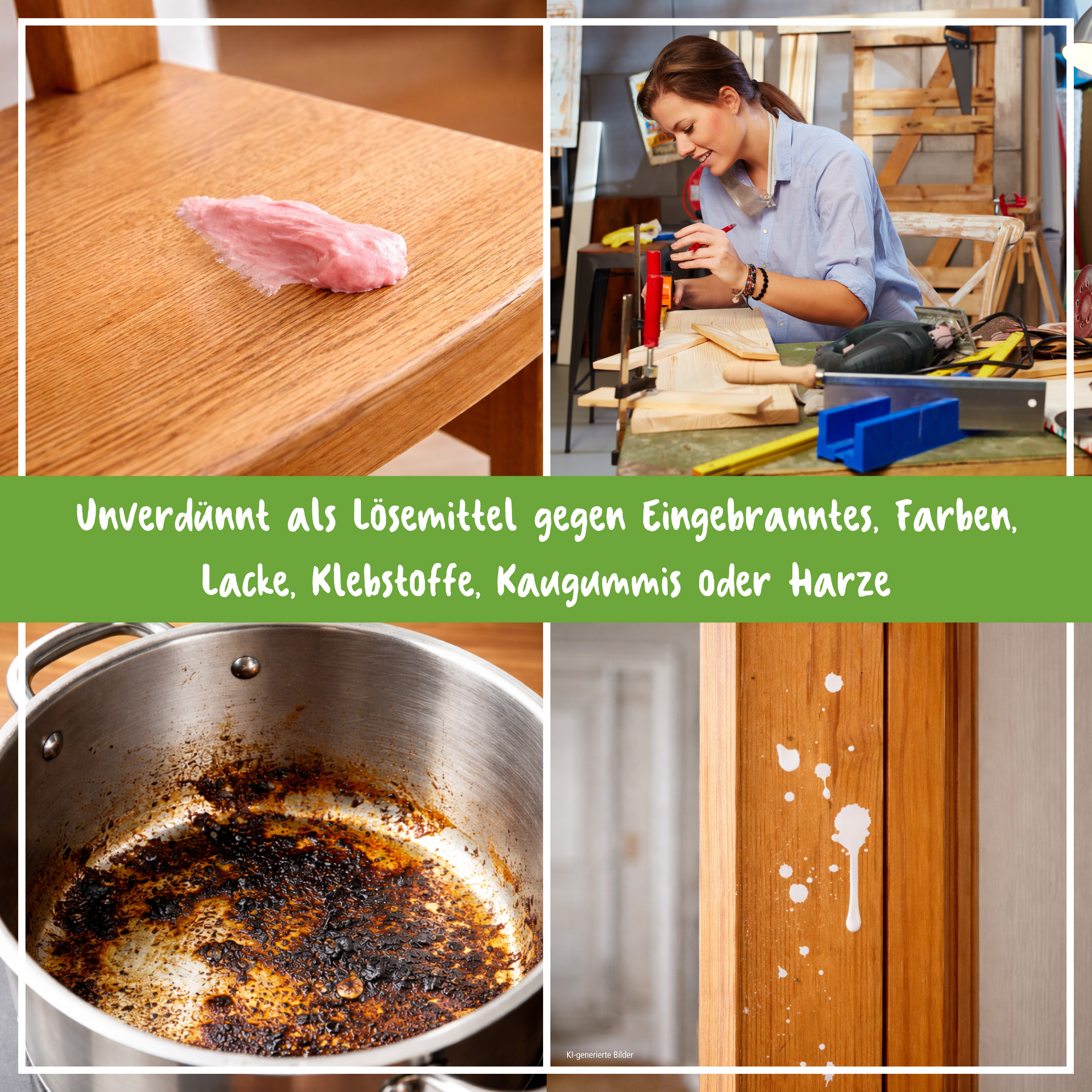 Unverdünnt gegen Eingebranntes, Farben, Lacke, Klebstoffe, Fette, Kaugummis, Harze etc.