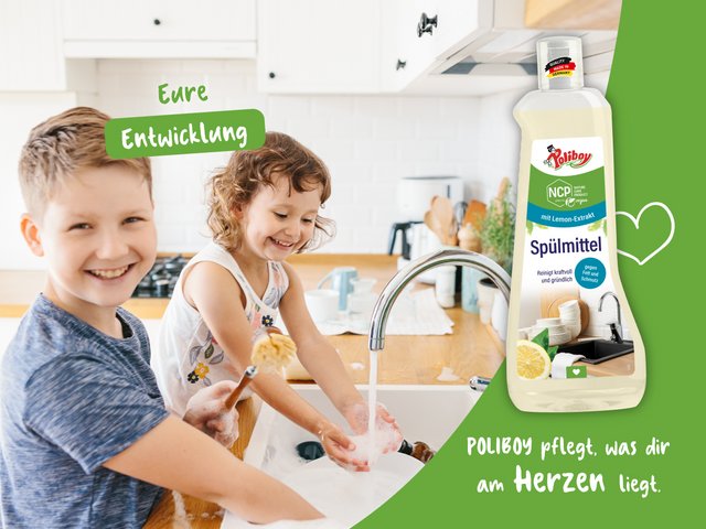 Das POLIBOY Spülmittel lemon entfernt Fettrückstände und Speisereste von Kochgeschirr.