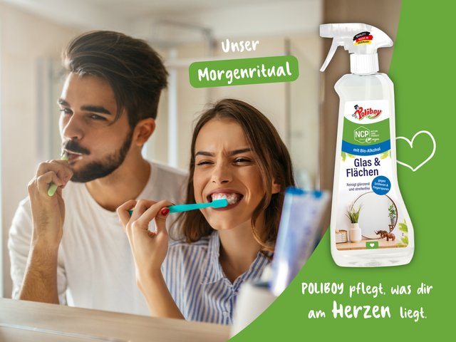 Der POLIBOY Glas & Flächen Reiniger säubert streifenfrei glatte Oberflächen mit Alkohol und Milchsäure.